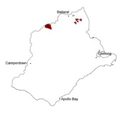 A diverse range of landforms are associated with the granite plutons which have been unroofed by erosion during the past 300 million years. The most common landscapes of the Palaeozoic granites are generally very subdued low hills and ridges of deeply weathered rock, such as those around Yendon and Lismore. In places, the deep weathering has produced thick (~40 m) kaolin clays, which are commercially mined at Pittong and Lal Lal. Based on oxygen isotope dates from these locations, the weathering is generally regarded as Neogene in age (Bird & Chivas 2002). However, in other locations the granites are exposed as tors (such as in the You Yangs), and as grus (such as on the flanks of Flagstaff Hill, Pittong). In some areas the metamorphic aureoles around the granites are resistant to weathering and form prominent ridges (such as the range south of Mount Bute at Pittong). |