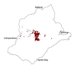 Alluvium terraces and floodplains are associated with the lake and swamp systems within the volcanic terrain as well as drainage systems such as the Barwon, Yarrowee/Leigh and Woady Yaloak rivers. Lakes and swamps, both permanent and ephemeral dominate the volcanic plains north and west of Colac. Hydrologically, the lakes vary from hypersaline groundwater discharge lakes (e.g. Lake Beeac) to groundwater throughflow lakes with surface water input (e.g. Lake Murdeduke) (Coram 1996). In the Lough Calvert region (east of Beeac), climate changes during the Pleistocene and Holocene have resulted in a complex landscape, as lunettes and alluvium deposits trace the changes in lake levels. Alluvial terraces and lunettes have been formed and partially destroyed by oscillating lake levels (Edwards et al. 1996). Associated soil types include black and grey self-mulching and cracking clays, black (and some red) sodic texture contrast and dark loam soils. |