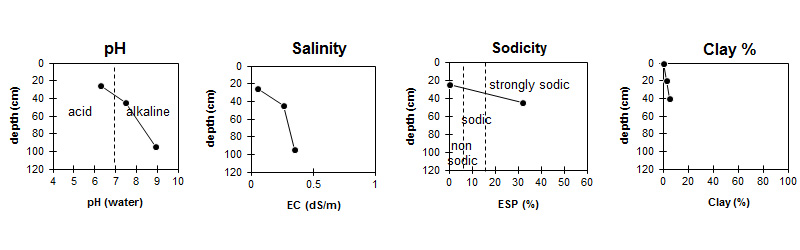 | The surface is slightly acid. The subsoil is slightly alkaline becoming strongly alkaline at depth. | Salinity rating is very low in the surface and low in the subsoil. | The soil is non sodic in the surface and strongly sodic in the subsoil. | The clay content is low throughout the profile. |
