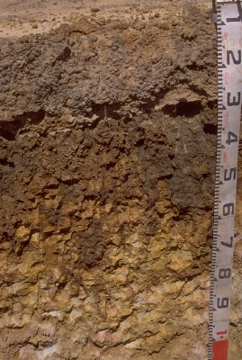 | A2c | 10-30 cm | Brown (10YR4/3 moist), conspicuously bleached (10YR7/4 dry); sand gravel; gravel is mostly medium to course rounded very hard ferruginous sandstone; pH 6.3; sharp and smooth change to: | |