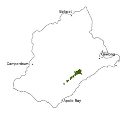 These texture contrast soils are found on Palaeogene sediments around the foothills of the Otway Range and have many of the characteristics of the non-sodic soils on Palaeogene sediments, but have strongly acidic upper subsoils, due mainly to greater leaching. An organic fine sandy clay loam (about 15 to 35 cm) clearly overlies a bleached massive sandy loam subsurface horizon often to a depth of 50 cm to 100 cm, abruptly overlying a coarse to medium strongly structured grey mottled (orange and yellow) light to medium clay which grades at about 100 cm or more into a sandy clay and/or cemented sandstone or calcareous