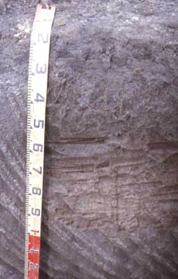 B21g | 70 + | Very dark greyish brown (10YR3/2 moist and 10YR5/2 dry), becoming mottled with depth (90 cm+); loamy fine sand; massive firm consistence; pH 4.7. | ||