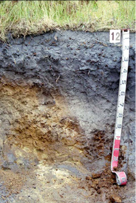 B22s | 85/130–+ | Very dark brown (10YR2/2); apedal massive structure; very strong consistence; weakly cemented ortstein; pH 6.0. | ||