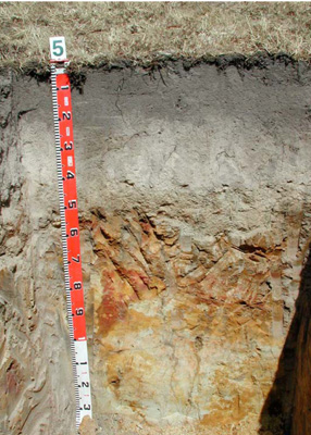 C1 | 100–125 cm | Light grey (10YR7/2) with common large yellow (10YR6/6) prominent mottles; clayey fine sand; apedal massive structure; earthy fabric; very firm consistence (dry); pH 7.5; smooth clear boundary to: | ||||