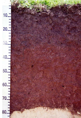 B21 | 23–75 | Dark reddish brown (5YR3/3); medium clay; strong very fine to fine polyhedral and lenticular structure; smooth ped fabric; strong consistence (dry); pH 5.5; sharp wavy boundary to: | ||
