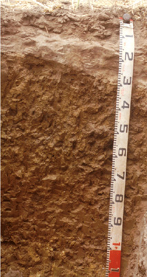 B21t | 20/35–65 | Brown (10YR4/3) ped faces with yellowish brown (10YR5/6) matrix with common (10-20%) red (10R4/6) mottles; medium clay; coarse (40-80 mm) prismatic (some peds tending to have domed tops, i.e. columnar) parting to coarse (20 mm) angular blocky, polyhedral and even lenticular peds; pH 8; gradual or diffuse boundary to: | ||
