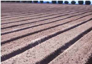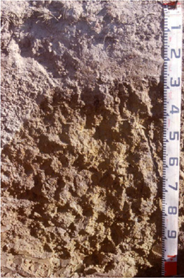 | Described by the owner as ‘crabhole country’, this slightly elevated, gently sloping land has well developed ‘gilgai’ features in the subsoil. The very variable nature of this soil is evident in material in the beds which have white A2 horizon material, buckshot, pisolitic cemented buckshot and subsoil clay all present at the ground surface. ‘Spew’ or ‘hollow units’ are elongated downslope (~10 m). ‘Puffs’ are of smaller lateral dimensions than the ‘hollows’ being 1–3 metres across. In the excavated pit, two faces were picked back. SFS5a to show deep A2 with buckshot and SFS5b to show puff unit (shallow depth to clay). This soil presents real problems to the agriculturalist. Water holding properties are extremely different in the ‘puff’ compared with the hollow and this is often evident in the crop. The topsoil is not well structured, disintegrates to a ‘flour’ when dry-tilled, is weak and ‘spewy’ when wet and hard set when dry. Protection of the surface with ground cover is essential to reduce the slaking and sealing effects of rain. Under high rainfall / runoff conditions this soil is potentially highly erodible. The subsoil is sodic and has a high clay content so this soil is also prone to severe waterlogging. The slope of the land and the forming of beds should alleviate this in the surface horizons but erosion is a potential hazard should the furrows carry excessive runoff. | ||||