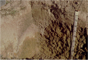 Ap | 0–20 | Brown (10YR4/3 moist) to pale brown (10YR6/3 dry), fine sandy loam to loam, weak to very firm consistence (depending on colour – lighter = stronger); Highly variable and mixed material. Ap originally likely to be less than 10 cm and is now dominated by apedal, A2 material. pH 5.5; clear boundary to: | ||