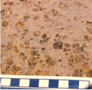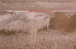 A2c | 15–40/45 | Pale brown (10YR6/3 moist), conspicuously bleached (10YR7/3 dry); fine sandy loam, gravelly; apedal structure; abundant (50%), medium (5–25 mm) buckshot gravel with black manganiferous centres, becoming cemented at base of horizon; buckshot can be broken with some finger force; pH 5.4; clear boundary to: | ||