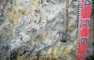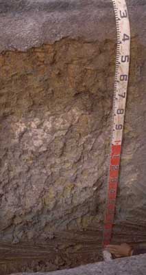 B22g | 60–90 | Light olive brown (2.5Y5/4 moist) with prominent yellowish brown (10YR7/8 moist) to yellow (10YR5/8 moist) mottles; sandy clay; very coarse (50–100 mm) polyhedral, parting to coarse (20–50 mm) blocky structure; sand coatings (whitish) on the larger ped faces; pH 5.5; clear smooth boundary to: | ||