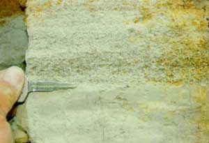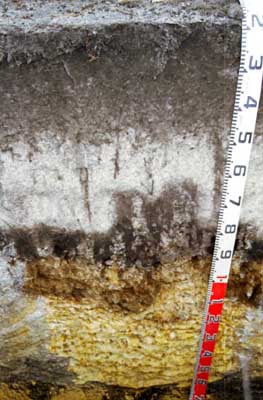 | Extremely acid profile is typical for this type of soil. The bleached A2 horizon is “spewy” and weak when wet and very hard when dry. The B horizon ‘coffee rock’ acts as a barrier to water movement and to root growth. Compare this profile with SW60. | ||||