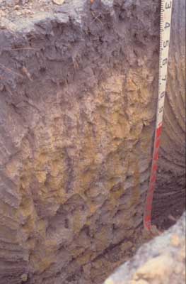 B22g | 120 + | Light brownish grey (10YR6/2) with very coarse prominent yellowish brown (10YR5/6 and 5/8) mottles; clayey sand; apedal. | ||