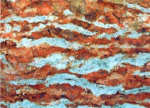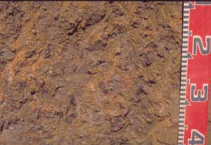 B/C | 210/300+ | Conspicuous reticulate laminar mottling; ‘tiger mottles’, red (10R4/6) and grey (2.5Y6/1); lamellae 10-20 mm apart; red matrix is rigid strongly cemented ferruginised sand, grey lamellae are soft sandy to clay; margins of lamellae are often yellow (10YR7/8) to yellowish brown (10YR5/8), red matrix frequently presents as angular ironstone gravel (10-20 mm). | ||