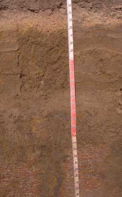 A2 | 40–50/60 | Brown (10YR4/3 moist), yellowish brown (10YR5/4 dry) in upper part of horizon, tending to olive brown (2.5Y4/4 moist), light olive brown (2.5Y5/6 dry); fine sandy clay loam; occasional buckshot gravel in lower part of horizon and some manganiferous mottles or soft concretions; faint rusty mottles (~5 mm); weak consistence; pH 5.8; clear and wavy boundary to: | ||