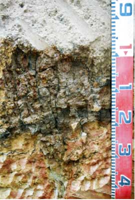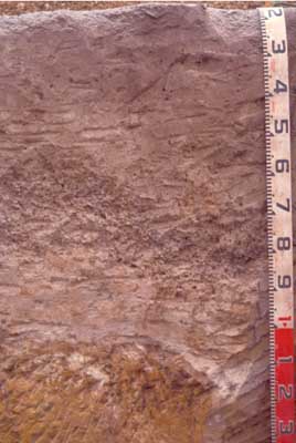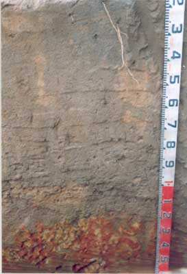 B22g | 150–200 | Yellowish brown (10YR5/8 moist) (50%) and light greenish grey (5GY7/1 moist) (50%); very dark greyish brown (10YR3/2 moist) coatings; sandy light clay; pH 6; clear boundary to: | ||