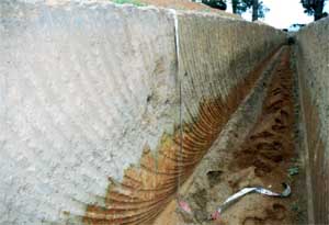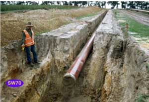 Contrasting soils upslope from SW70 showing deep sandy profile over ferruginised (iron-enriched) sedimentary parent material; profile with thin sodic clay B horizon at 1 metre (left), trench cutting (centre), profile with no clay B horizon and no ironstone gravel (right) | ||