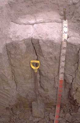 B21t | 40–90 | Very dark grey (10YR3/1 moist) with fine yellowish brown (10YR5/8) mottles; heavy clay; coarse (up to 400 mm) columnar structure, parting with difficulty to coarse blocky structure; slickensides across ped; gradual boundary to: | ||