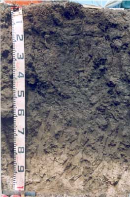 B23 | 60-80 | Dark greyish brown (2.5Y4/2 moist); light medium clay; apedal; pH 8.8; clear boundary to: | ||