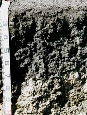B21ss | 15-50/70 | Black (2.5Y2.5/1 moist, dry); heavy clay; strong, coarse (>100 mm) irregular lenticular structure, parting with difficulty to medium (>20 mm) lenticular peds, prominent slickensides increasing in size with depth; pH 8.0; clear and wavy boundary to: | ||