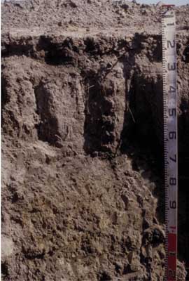 | Strong texture contrast between surface (A) horizons and subsoil (B21) horizon can result in waterlogging. This is aggravated in this soil by the very coarse prismatic to columnar structure in upper subsoil which is highly sodic and dispersive. | ||||