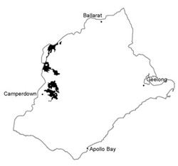 2.22% of CMA region The unit consists of an irregular surface of widespread basalt lava flows in which hummocks, depressions, ridges and blind channels have given rise to a completely confused topography. These stony rises occur along the Corangamite and Glenelg- Hopkins catchment boundary and have relief of less than 10 m. The stony rises are relatively recent basalt flows and have experienced little regolith and drainage development within the Western Plains. The rises are comprised of stony mounds that have shallow red and/or black loamy soils, numerous swamps with black cracking clays and gentle plains that are relatively rock-free with texture contrast soils. The only vegetation class of these plains is the Stony Rises Herb-rich Woodland. This unit is large and there are many equivalent areas within the Glenelg-Hopkins catchment. Other basaltic units and alluvial streams surround the stony rises. Land use is grazing (mainly sheep) with cropping on rock free plains and swamps. While the stony nature of soils is a major limitation, waterlogging is a productivity issue particularly on the former swamps due to their low relief and the impermeable nature of these soils. |