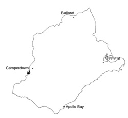 0.12% of CMA region This unit of undulating low hills is part of the Western Plains. This single unit occurring in the west of the Corangamite CMA region (north of Cobden) is a ‘window’ of Neogene sediments surrounded by basalt, including a number of eruption points. This area is a major area of dissection of Neogene sediments. Unit components are hill crests, upper, mid and lower slopes on the low hills, and drainage lines. The soils are acidic mottled brown texture contrast soils (Chromosols). Susceptibility to waterlogging occurs in the depressions, but given the higher rainfall of the area and light surface soils, susceptibility to nutrient decline is high. Slight to moderate susceptibility to sheet erosion occurs on the slopes. Land use is intensive grazing (dairying) and some cropping. |