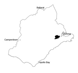 0.69% of CMA region Rolling hills with fertile soils to the west of Geelong lie mainly to the north of the present study area, but a small section forms the northern part of the catchment of Thompson Creek. These hills are on Lower Cretaceous sandstones and mudstones similar to those outcropping extensively in the Otway Range, but the landscape is more subdued and the rainfall is significantly lower. The original structure and species composition of the native vegetation are difficult to determine. The area has been extensively cleared for cropping and grazing and subdivided into somewhat smaller paddocks than the less fertile areas to the south. From the presence of isolated trees, Eucalyptus globulus and E. cypellocarpa formed part of the original vegetative community, and it is probable that E. radiata was also common. |