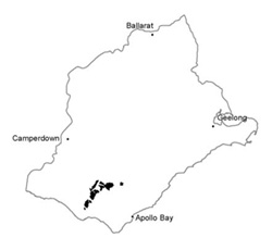 0.79% of CMA region Low woodlands of Eucalyptus nitida with understoreys of Leptospermum continentale, L. myrsinoides and Xanthorrhoea australis characterise these hills on the western periphery of the Otway Range. The soils are mainly deep, infertile and excessively drained sands, which contrast sharply with the adjacent gradational profiles of the Lower Cretaceous outcrops. Thus, although rainfall is high, moisture stress and soil infertility severely restrict plant growth. Some attempts have been made to clear tracts of this land and establish pastures for cattle grazing. Trial plots of pine species have also been established. Given sufficient fertiliser and soil ameliorants (such as lime), pastures or even intensive crops could be successfully grown. However, the rates of such chemicals needed to achieve satisfactory production are high and most of the land remains in its natural state. The main activity has been the opening up of numerous soil and gravel extraction pits, most of which have failed to regenerate naturally and now remain as scars on the landscape. |