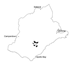 0.11% of CMA region North of Forrest and extending towards Colac, undulating plains with often deeply weathered soils are found. The geology is mainly Pliocene clay with minor outcrops of sand. Redistribution of surface sand has resulted in polygenetic soils over much of the landscape, with weak hardpan development and impeded drainage. Surface soils seem to be naturally low in plant nutrients. Many areas remain uncleared and support open forests dominated by Eucalyptus obliqua and E. radiata. E. baxteri is notably absent in this slightly drier region. Other areas have been cleared for agriculture or converted to pine plantations. The main hazards to land use are loss of soil structure by compaction and leaching of nutrients. |