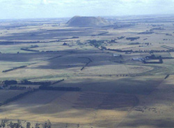 0.02% of CMA region The steep high cone of Mount Elephant at Derrinallum is a major topographical feature of the Western Plains and can be viewed from great distances (i.e. Ballarat). This majestic steep cone is derived from volcanic scoria and basalt and is surrounded by a large area of stony rises. The volcanic eruption point on the Western Plains has nearly 100 m of local relief and abuts the western boundary of the Corangamite catchment. The cone has been extensively cleared with little remnant vegetation (including Stony Rises Herb-rich Woodland and Scoria Cone Woodland) occurring as stands across the lower slopes. Other non-native plantations have occurred as shelter belts for stock on the lower slopes. Slopes have highly fertile loamy soils that have been used for grazing mainly due to the abundance of surface stone that limit cultivation. The basaltic rock and scoria and tuff support shallow red and black friable loamy soils on the crest and all slopes, with soils significantly deeper on lower slopes. Areas with shallow stony gradational soils are susceptible to leaching of nutrients, and compaction is a problem on the lower slopes. |