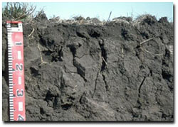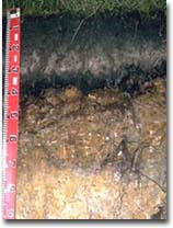 | Bh HORIZON: A subsoil horizon notation whereby the 'B' refers to the B Horizon and the 'h' to the humic horizon. Organic matter and aluminium compounds are strongly dominant (with very little or no trace of iron compounds). This term is used as a definition for the Podosol Order in the Australian Soil Classification (Isbell, 2002). |  Bh horizon at 30-40 cm depth in a West Gippsland Podosol. |