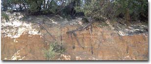 Thinner irregular coffee rock layer (Bhs horizon) at 80 cm depth in a Cranbourne Podosol.