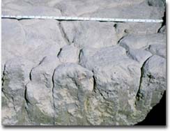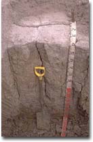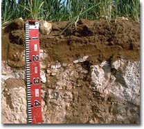 | CALCRETE: A layer where cemented carbonate accumulation has occurred. The material must be hard in a pan or in the substrate. This definition does not describe the common soft carbonate nor the carbonate accumulated in nodules or concretions. This term is used to describe a number of soils in the Australian Soil Classification (Isbell, 2002). |  Calcrete layer at 20 cm depth in a Calcarosol near Walpeup. |
